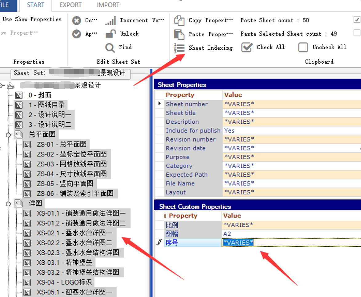 然后在ssmpropeditor中,先选择需要应用需要的图纸,然后选择右侧的序号(varies意思是这些图纸的此内容是不同的,无需纠结),然后点击ribbon中的SheetIndexing,就是图纸索引,