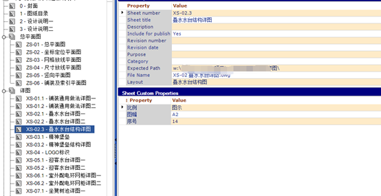 最上方是工具的ribbon界面,左边是图纸集的列表,右侧为具体的属性内容。
